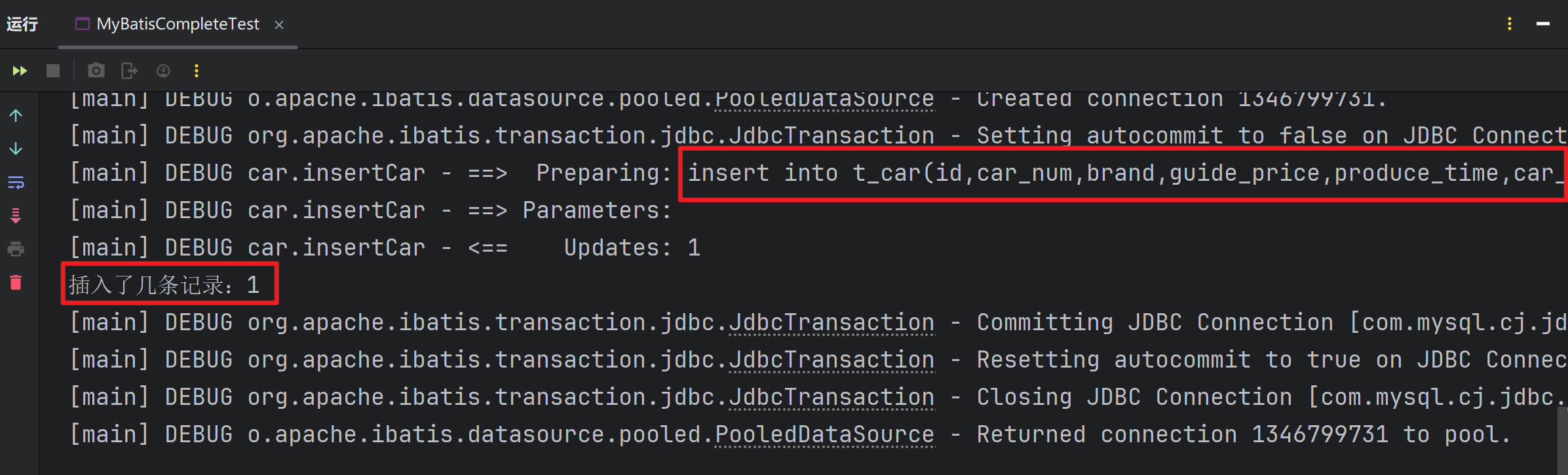 </configuration>- 再次执行单元测试方法testInsertCar,查看控制台是否有sql语句输出